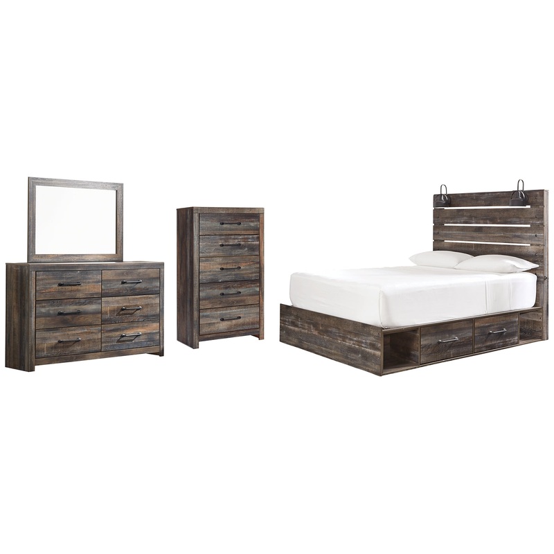 This queen-size panel bed with storage, dresser, mirror and chest of drawers is a refined take on barn board beauty. Its complex, replicated wood grain showcases hints of burnt orange and teal tones for a sense of weatherworn authenticity. Love to read in bed? Youre sure to find the pair of retro-chic light sconces and USB plug-ins on the open-slat style headboard such a bright idea. Double drawers at the foot of the bed also come in mighty handy. The chest and dressers smooth-gliding drawers lined with faux linen laminate and industrial dark-tone hardware complete this rustic and industrial style bedroom. Mattress and foundation/box spring available, sold separately.