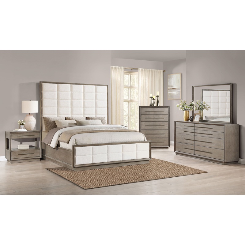 Invest in the inviting style and striking architectural allure of this five-piece modern bedroom set that centers on an upholstered bed. Perfect for relaxation in a soothing bedroom ensemble, the set delivers ample storage with a eight-drawer dresser and mirror, a five-drawer chest, and a two-drawer nightstand. Cool cream upholstery with grid style tufting decorates the bed, while a taupe oak wood finish is invitingly neutral to complement the linens of your choice. The extra-tall headboard creates a structured profile for the set, which is adorned with long bar pulls on its drawer fronts. Use wide tops for decor that brings personality and character to your welcoming, refined bedroom.