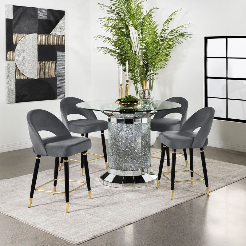 Perfect for contemporary entertainment areas, this chic, modern, glam counter height set hosts four guests comfortably. A round, clear glass top and round, column-inspired pedestal base float elegantly within your spacious room or breakfast nook. The pedestal table base boasts a brilliant faux diamond inlay and mirror tile that shimmers stunningly. Four counter height chairs feature open rounded backs upholstered in soft and smooth velvet for extra comfort and support. Each seat rests on slender legs, complete with golden metallic accents and a sturdy footrest for a dramatic contrast and glam touch.