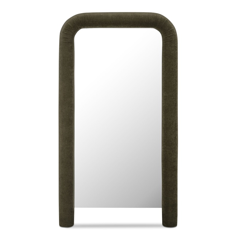 Ellison Mirror OliveProduct FeaturesLarge floor mirror with modern, soft corners with ruched detail & soft-touch fabric upholsteryGRS certified 50% recycled polyester, 50% new polyester upholstery. OEKO TEX standard 100Wall leaning with two post legs. Wall