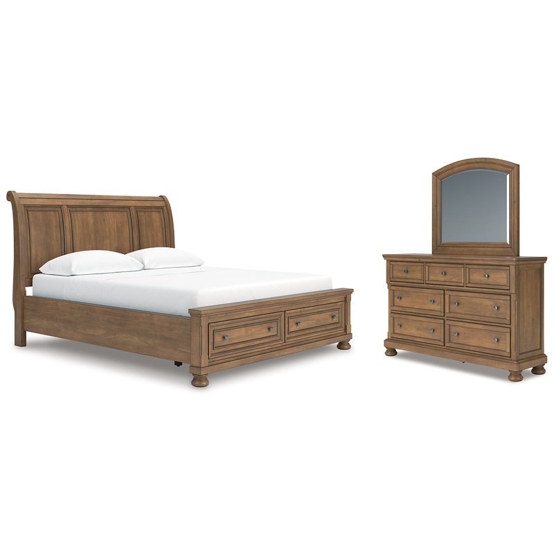 | Details | PCB779B9: Includes sleigh headboard, storage footboard and rails with roll slats, Made with pine solids, veneer and MDF substrate, Side rails feature laminated solid hardwood slat support rails (or LVL) with glued and screwed blocking for added strength, Chestnut brown wood-tone finish, Metal knobs with aged pewter-tone finish, 2 smooth-gliding drawers in footboard, Bed does not require additional foundation/box spring; accommodates most zero clearance adjustable bases with the addition of a bunkie board, Mattress available, sold separately, Assembly required, PCB779B1: Includes dresser and mirror, Made with pine solids, veneer and MDF substrate, Chestnut brown wood-tone finish, Metal knobs with aged pewter-tone finish, 7 smooth-gliding drawers with fully finished interiors, English dovetail construction and heavy-duty ball-bearing side glides (pull-out tray and top drawers felt lined), Pull-out tray behind top middle drawer, Mirror attaches to back of dresser, |