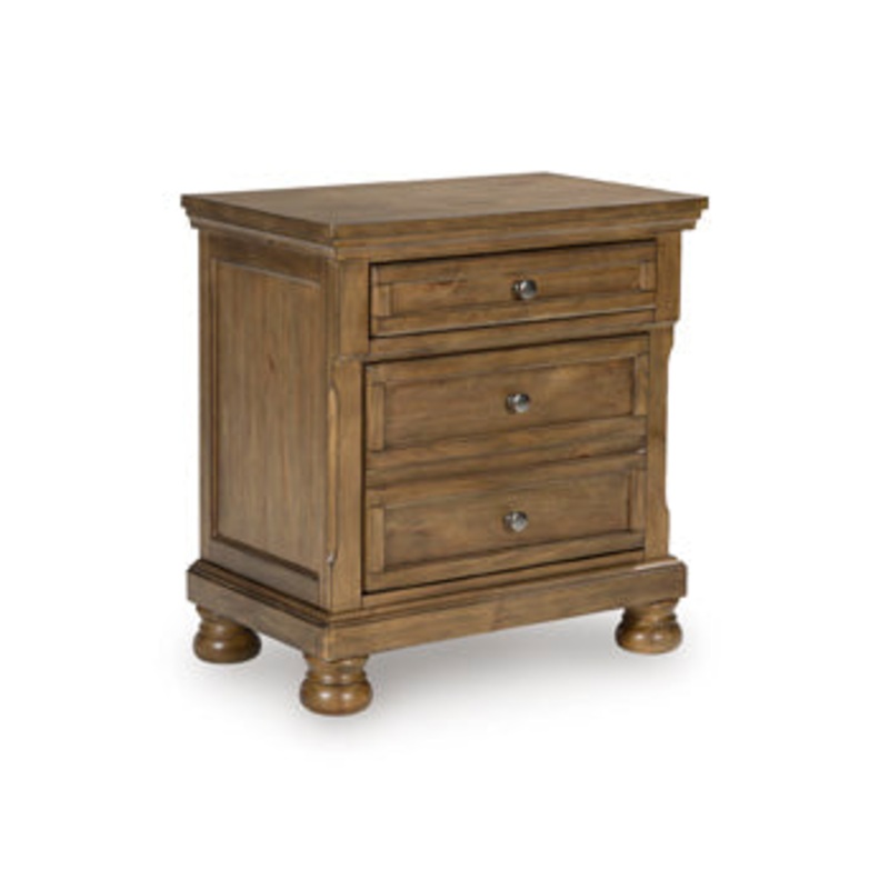 A relaxed take on casual traditional design, this nightstand strikes a comfy pose with a classic sensibility. Its timeless design and chestnut brown wood tone create a welcoming retreat tailored to your laid-back lifestyle. Metal knobs in an aged pewter color subtly dress up framed inset drawers that store nighttime essentials. A hidden pull-out tray behind the bottom drawer keeps your small valuables out of sight.