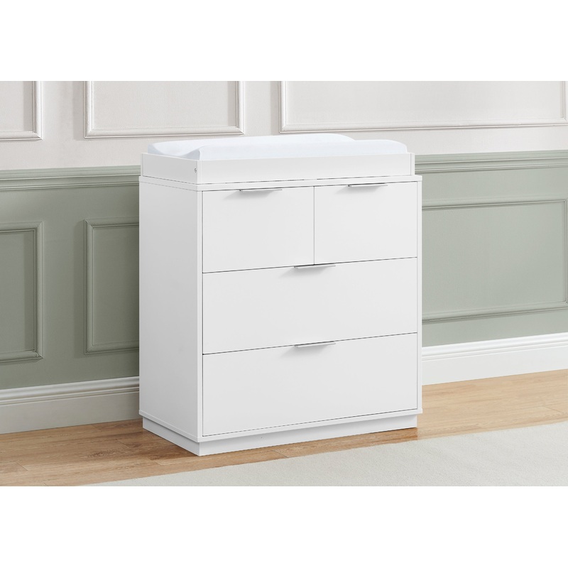 With clean lines and sleek platform base, the Forever 4 Drawer Dresser with Changing Top by Delta Children is a timeless design that’s totally at home in the modern nursery or kid’s room. With multiple sets of knobs included, kids (or parents!) can choose to mix and match hues or showcase their favorite, while four spacious drawers and included changing top make this dresser everything you need for your childs space (changing pad sold separately). When your child grows, just remove the topper, and it easily transitions into a stand-alone dresser. Constructed from made-to-last sustainable materials to ensure stability and longevity, this dresser is also GREENGUARD Gold Certified, which means its built to contribute to cleaner air for a healthy home. For your childs safety, this dresser is outfitted with an interlocking drawer system that limits the number of drawers that can be opened at one time.This dresser is tested to meet the current requirements of ASTM F2057, the mandatory CPSC safety standard that protects young children from furniture tip-over incidents. For your childrens safety, only purchase dressers that comply with this standard. For additional security, Delta strongly recommends that all dressers in your home be anchored; all Delta dressers include a wall anchor. To learn how to properly secure your dresser, please see the product assembly instructions or visit our website.