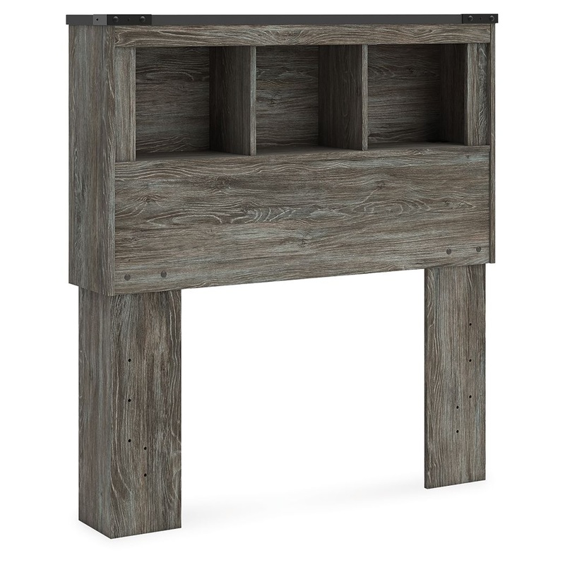 Cool, casual style is for all ages. With this bookcase headboard, they get the function they need plus the refined design you love. Approachably neutral in a rustic warm gray, its adaptable enough to pair with an assortment of existing colors and room decor. Faux metal detailing with nailhead accents lends an industrial edge. And handy storage cubbies keep books, toys and other bedtime necessities within easy reach.