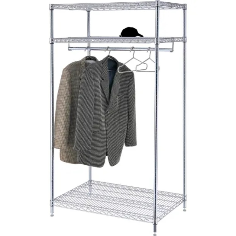Nexel 3 Shelf Garment Floor RackAttractive solution to garment storage. Durable chrome plated steel wire design minimizes dust accumulation. Resists denting, chipping and rusting. The full length coat rod holds up to 250 lbs. Dimensions: 24"D x 36"W x 74"H