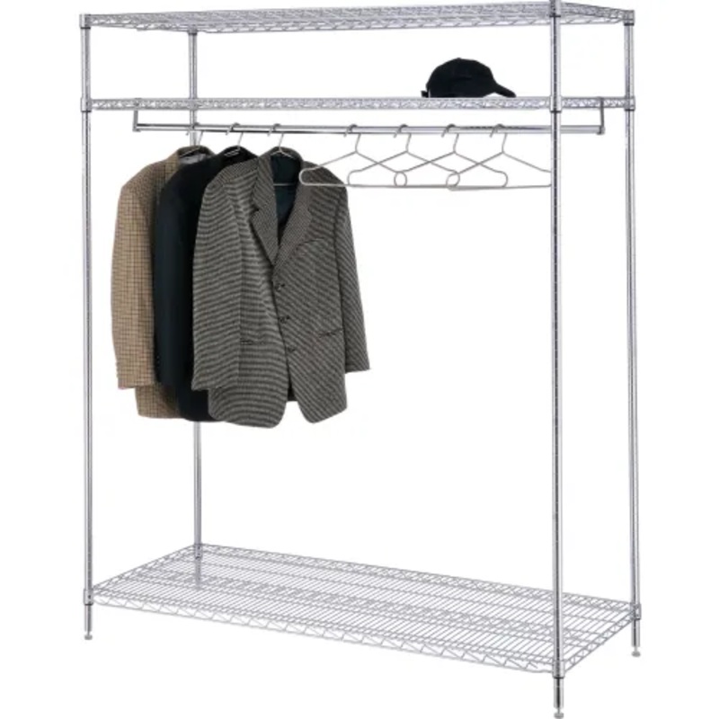 Attractive solution to garment storage. Durable chrome plated steel wire design minimizes dust accumulation. Resists denting, chipping and rusting. The full length coat rod holds up to 250 lbs. Dimensions: 24″D x 60″W x 74″H. Assembles quickly. Optional casters and hangers available.