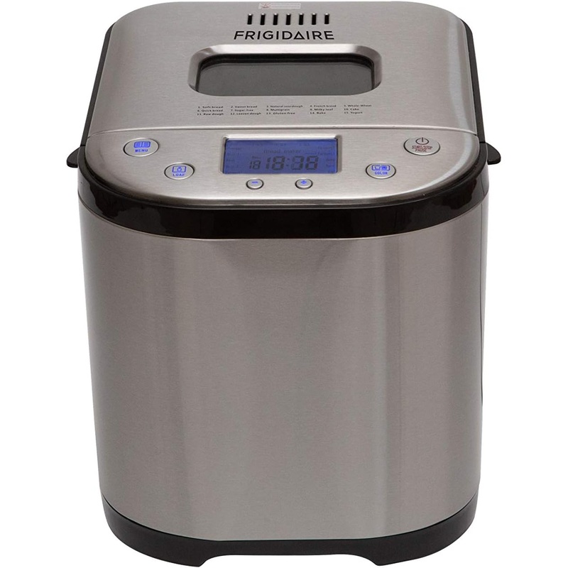 FRIGIDAIRE Bread Maker Machine with Nonstick Bowl, Bread Hook, Measuring Cup & Spoon. 15-in-1, Gluten-Free Bread, Cake& Yogurt, 3 Crust Colour options and more. 3 Loaf Sizes. 2LB XL- Stainless Steel 15 SETTINGS FOR PERFECT BREAD EVERY TIME -Whole Grain Bre