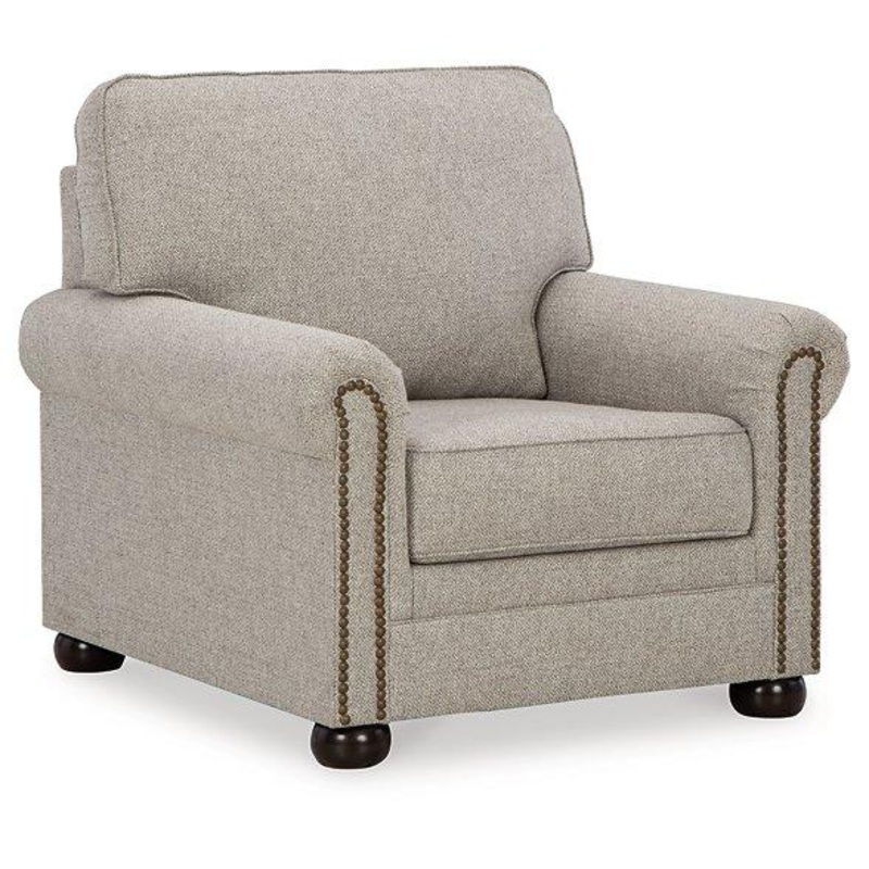 Inspired by the past but rooted firmly in the present, this chair complements your transitional seating area. Its versatile upholstery is delightfully detailed for a subtle herringbone effect. Designer touches like decorative nailhead trim and bun legs add traditional character. With this chairs reliable style and comfort, all you need to do is sit back and relax.