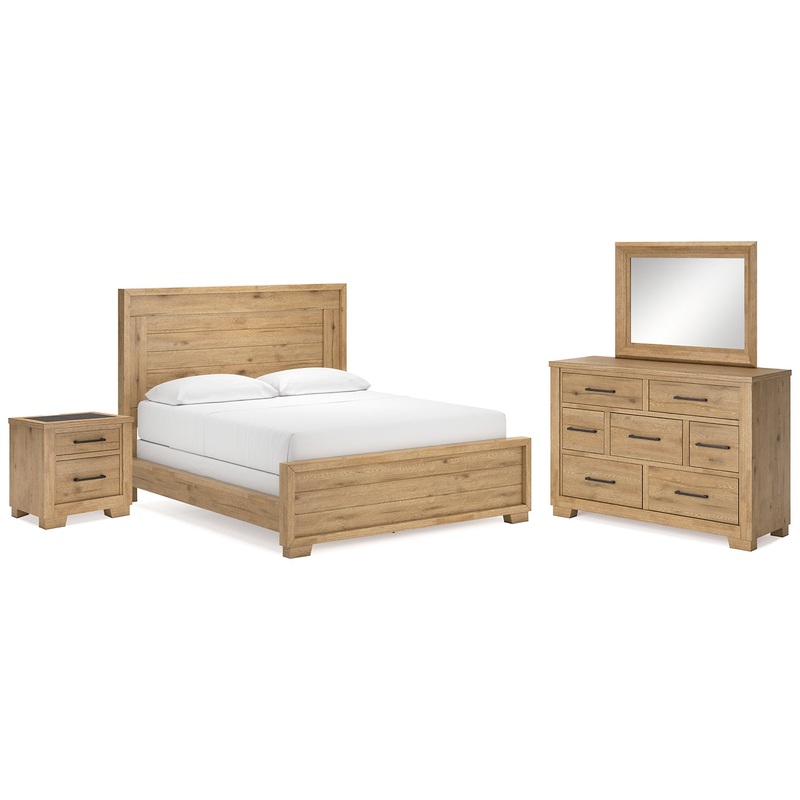 | Details | B841B5: Includes panel headboard and footboard with rails, Made with hardwood solids and thick rustic oak veneer, Glazed natural light oak color finish enhances the natural characteristics of the veneer, Thick metal bar pulls with a hammered textural surface in an aged bronze-tone finish, Foundation/box spring required, sold separately, Mattress available, sold separately, Natural wood may display natural weathering, unique cracks, splits, knots, saw marks or other organic features unique to each piece, Assembly required, B841B1: Includes dresser and mirror, Made with hardwood solids and thick rustic oak veneer, Glazed natural light oak color finish enhances the natural characteristics of the veneer, Thick metal bar pulls with a hammered textural surface in an aged bronze-tone finish, 7 drawers with fully finished interior, dovetail construction and ball-bearing side glides, Natural wood may display natural weathering, unique cracks, splits, knots, saw marks or other organic features unique to each piece, Mirror attaches to back of dresser, B841-92: Made with hardwood solids and thick rustic oak veneer, Glazed natural light oak color finish enhances the natural characteristics of the veneer, Top with cement tile inlay, Thick metal bar pulls with a hammered textural surface in an aged bronze-tone finish, 2 drawers with fully finished interior, dovetail construction and ball-bearing side glides, 110V power supply with dual USB charging ports, Natural wood may display natural weathering, unique cracks, splits, knots, saw marks or other organic features unique to each piece, Power cord included; UL Listed, |
