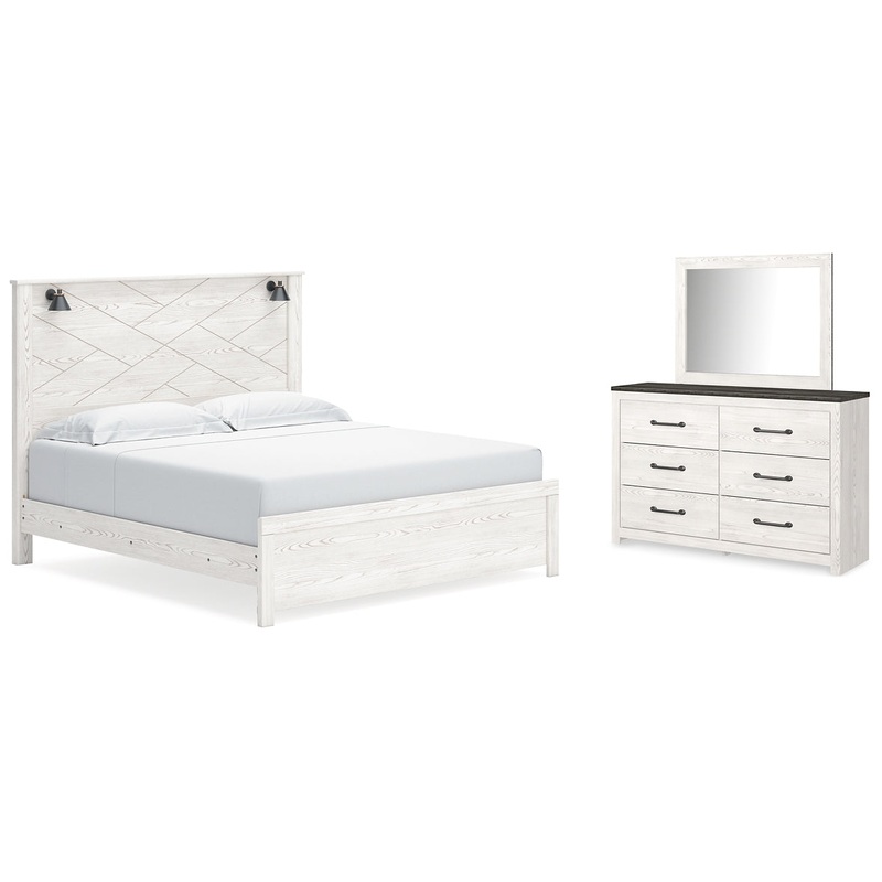 Details B1190B9: Includes king panel headboard, footboard and rails, Made with engineered wood (MDF/particleboard) and decorative laminate, White rustic finish with replicated cedar grain and authentic touch, 2 decorative sconce lights, Lights in matte black finish with champagne-colored accents, Headboard with abstract design, Power cord included; UL Listed, Foundation/box spring required, sold separately, Mattress not included, sold separately, Assembly required, Bed is compatible with an adjustable base, B1190B1: Includes dresser with mirror, Made of engineered wood (MDF/particleboard) and decorative laminate, White rustic finish with replicated cedar grain, Rustic gray planked replicated oak grain with authentic touch, 6 smooth-gliding drawers with faux linen lining, Large scale dark colored handles, Mirror attaches to back of dresser, Assembly required,