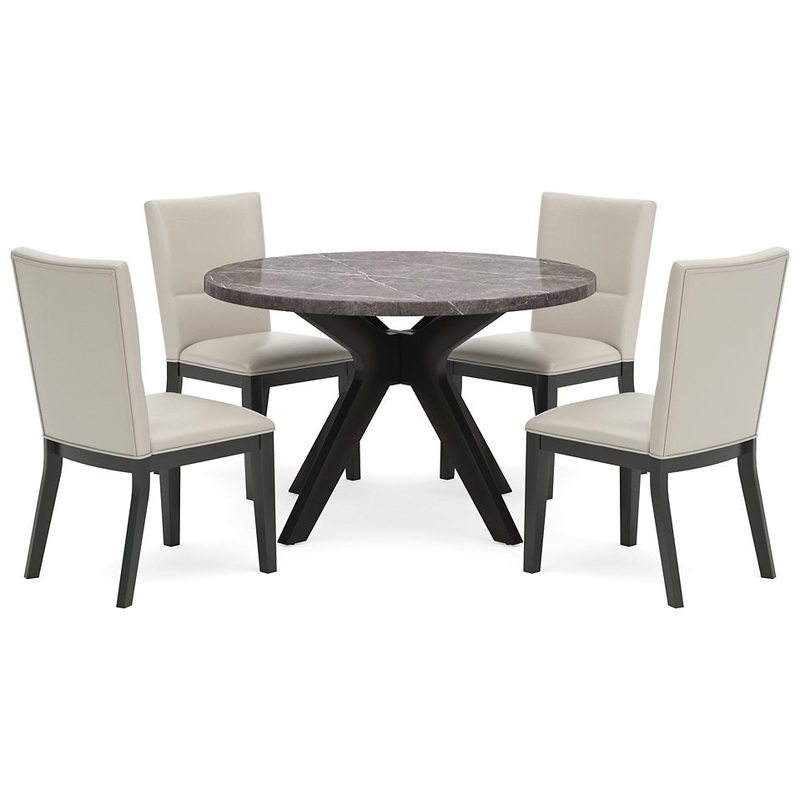 Embrace the feel of casual contemporary design when you sit down to this dining package. Matte black frames and a contrasting faux marble tabletop give off a decidedly modern vibe. And with faux leather upholstery on the chairs, this set's comfort and clea