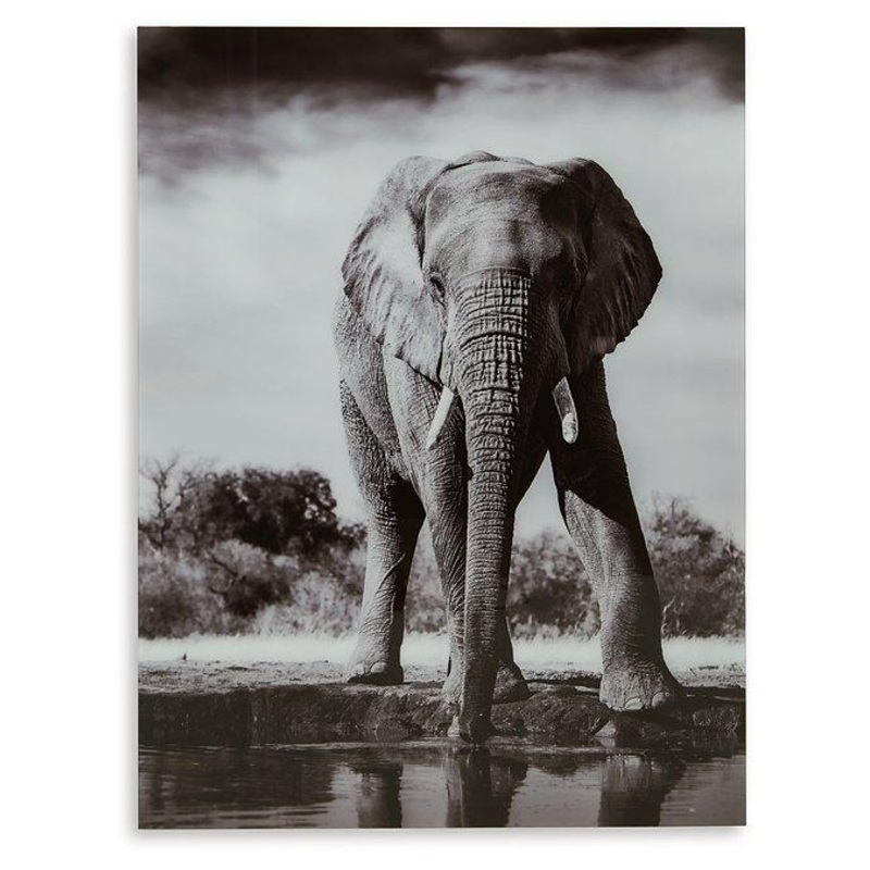 The elephant has long symbolized strength, intelligence and good luck. Celebrate this majestic creature and express your personality with this wall art. The black and white print on glass makes a bold and visually striking statement.
