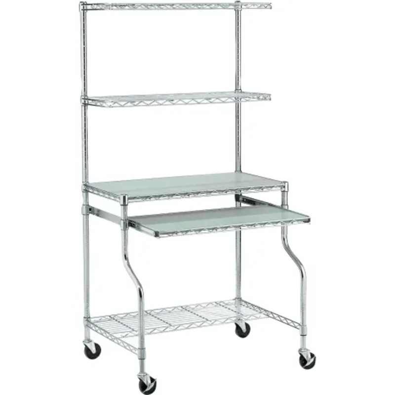 In your facility, office or warehouse, this mobile workstation rolls wherever you need it and uses minimal space. Entire workstation is adjustable in 1″ increments. Two adjustable upper shelves (31-1/2″W x 12″D) easily accommodate computer accessories and supplies. Large 31-1/2″W x 17-1/2″D worksurface is made of 1/2″ thick stain and scratch resistant lacquered fiberboard. Worksurface is 31-1/2″H. Adjustable height slide-out keyboard/mouse drawer (27″W x 13-1/2″D) and 12″D lower storage shelf. 3″ PVC casters (two locking) allow for easy mobility. Easy assembly.