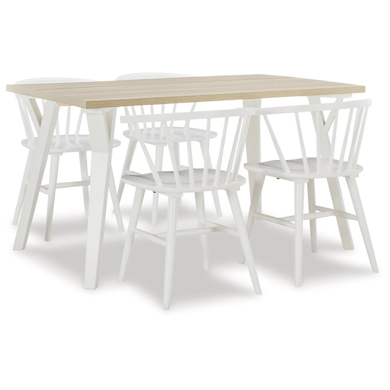 Bring light to your dining area with the clean lines and bright two-tone finish of this dining package. The rectangular dining table, with stylized saber legs in a white finish, matches the spindle-back chairs for beautiful simplicity. The tables melamine