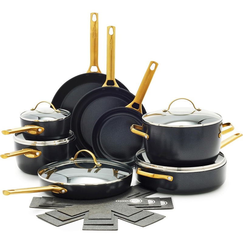GreenPan Reserve Hard Anodized Healthy Ceramic Nonstick, 16 Piece Cookware Pots and Pans Set, Gold Handle, PFAS-Free, Dishwasher Safe, Oven Safe, Black World-class tech meets minimalist style in the GreenPan Reserve collection. And this sleek collection is