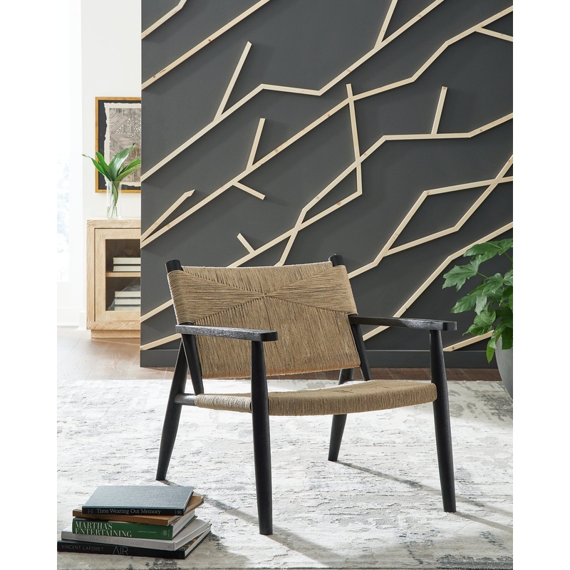 Understated style done beautifully well. This accent chair's natural jute upholstery offers a striking contrast with its black wood frame. Combining a contemporary aesthetic with a mid-century vibe, it's ideal for the living room or bedroom.SpecificationsH