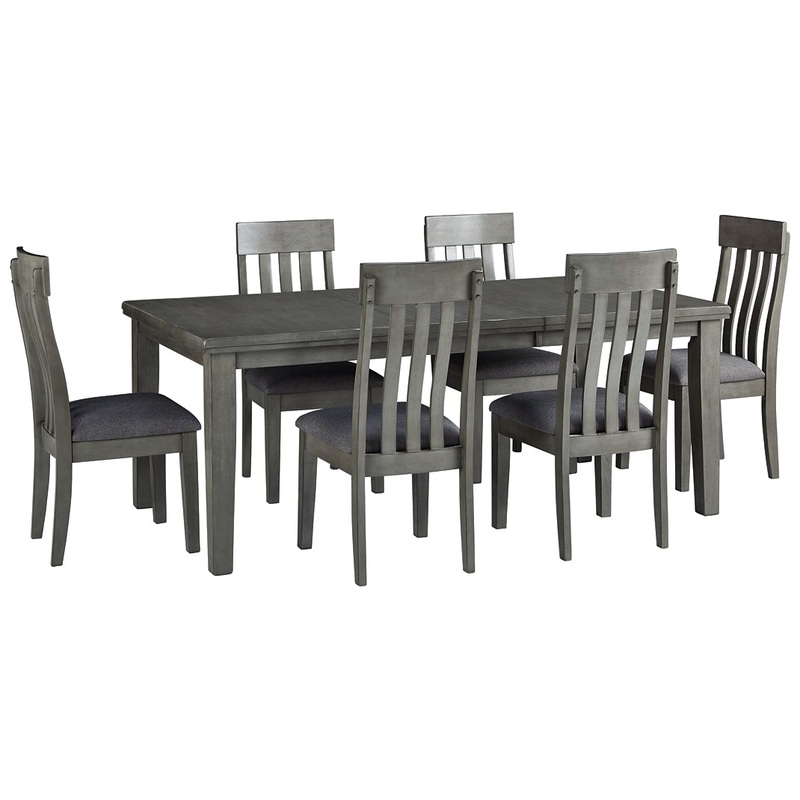 Cool and on-trend. This dining package sports a two-tone gray look for a contemporary-yet-casual feel. The rectangular table features a thick sturdy top with a self-storing butterfly leaf, making it a breeze to expand your table space. Comfortably cushioned, the side chair features a padded seat, while its contoured comb-back design adds a dash of geometric flair. Gray textural fabric pairs seamlessly with the antiqued gray finish of the table.