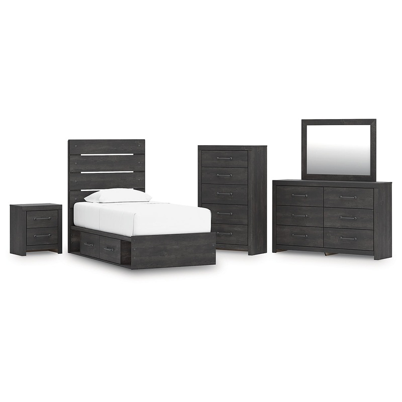| Details | PCB2108B18: Includes panel headboard/footboard, 2 under bed storage units and roll slats, Made with engineered wood (MDF/particleboard/plywood) and decorative laminate for the right balance of affordability and durability , Charcoal finish over replicated oak wood grain with authentic touch, Decorative laminate replicates natural or man-made material surfaces with consistent color, pattern and texture, 4 smooth-gliding drawers, 4 storage cubbies, Bed does not require additional foundation/box spring; accommodates most zero clearance adjustable bases with the addition of a bunkie board, Mattress available, sold separately, Minor assembly required, PCB2108B1: Includes dresser and mirror, Made with engineered wood (MDF/particleboard/plywood) and decorative laminate for the right balance of affordability and durability , Charcoal finish over replicated oak grain with authentic touch, Decorative laminate replicates natural or man-made material surfaces with consistent color, pattern and texture, Large-scale dark colored handles, 6 smooth-gliding drawers, Drawer interiors are lined with a faux linen laminate for a clean, finished look , Mirror attaches to back of dresser; can also be mounted on wall horizontally or vertically, Safety is a top priority, clothing storage units are designed to meet the most current standard for stability, ASTM F 2057 (ASTM International), Drawers extend out to accommodate maximum access to drawer interior while maintaining safety, Minor assembly required, PCB2108-46: Made with engineered wood (MDF/particleboard/plywood) and decorative laminate for the right balance of affordability and durability, Charcoal finish over replicated oak grain with authentic touch, Decorative laminate replicates natural or man-made material surfaces with consistent color, pattern and texture, Large-scale dark colored handles, 5 smooth-gliding drawers, Drawer interiors are lined with a faux linen laminate for a clean, finished look, Safety is a top priority, clothing storage units are designed to meet the most current standard for stability, ASTM F 2057 (ASTM International), Drawers extend out to accommodate maximum access to drawer interior while maintaining safety, Minor assembly required, PCB2108-92: Made with engineered wood (MDF/particleboard/plywood) and decorative laminate for the right balance of affordability and durability, Charcoal finish over replicated oak grain with authentic touch, Decorative laminate replicates natural or man-made material surfaces with consistent color, pattern and texture, Large-scale dark colored handles, 2 smooth-gliding drawers, Drawer interiors are lined with a faux linen laminate for a clean, finished look, 2 slim-profile USB-C charging ports, Power cord included; UL Listed, Minor assembly required, |