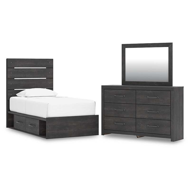 | Details | PCB2108B17: Includes panel headboard/footboard, rails with side storage and roll slats, Made with engineered wood (MDF/particleboard/plywood) and decorative laminate for the right balance of affordability and durability , Charcoal finish over replicated oak grain with authentic touch, Decorative laminate replicates natural or man-made material surfaces with consistent color, pattern and texture, 2 smooth-gliding drawers, 2 storage cubbies, Bed does not require additional foundation/box spring; accommodates most zero clearance adjustable bases with the addition of a bunkie board, Mattress available, sold separately, Minor assembly required, PCB2108B1: Includes dresser and mirror, Made with engineered wood (MDF/particleboard/plywood) and decorative laminate for the right balance of affordability and durability , Charcoal finish over replicated oak grain with authentic touch, Decorative laminate replicates natural or man-made material surfaces with consistent color, pattern and texture, Large-scale dark colored handles, 6 smooth-gliding drawers, Drawer interiors are lined with a faux linen laminate for a clean, finished look , Mirror attaches to back of dresser; can also be mounted on wall horizontally or vertically, Safety is a top priority, clothing storage units are designed to meet the most current standard for stability, ASTM F 2057 (ASTM International), Drawers extend out to accommodate maximum access to drawer interior while maintaining safety, Minor assembly required, |