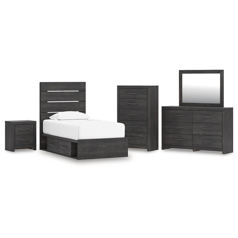 | Details | PCB2108B17: Includes panel headboard/footboard, rails with side storage and roll slats, Made with engineered wood (MDF/particleboard/plywood) and decorative laminate for the right balance of affordability and durability , Charcoal finish over replicated oak grain with authentic touch, Decorative laminate replicates natural or man-made material surfaces with consistent color, pattern and texture, 2 smooth-gliding drawers, 2 storage cubbies, Bed does not require additional foundation/box spring; accommodates most zero clearance adjustable bases with the addition of a bunkie board, Mattress available, sold separately, Minor assembly required, PCB2108B1: Includes dresser and mirror, Made with engineered wood (MDF/particleboard/plywood) and decorative laminate for the right balance of affordability and durability , Charcoal finish over replicated oak grain with authentic touch, Decorative laminate replicates natural or man-made material surfaces with consistent color, pattern and texture, Large-scale dark colored handles, 6 smooth-gliding drawers, Drawer interiors are lined with a faux linen laminate for a clean, finished look , Mirror attaches to back of dresser; can also be mounted on wall horizontally or vertically, Safety is a top priority, clothing storage units are designed to meet the most current standard for stability, ASTM F 2057 (ASTM International), Drawers extend out to accommodate maximum access to drawer interior while maintaining safety, Minor assembly required, PCB2108-46: Made with engineered wood (MDF/particleboard/plywood) and decorative laminate for the right balance of affordability and durability, Charcoal finish over replicated oak grain with authentic touch, Decorative laminate replicates natural or man-made material surfaces with consistent color, pattern and texture, Large-scale dark colored handles, 5 smooth-gliding drawers, Drawer interiors are lined with a faux linen laminate for a clean, finished look, Safety is a top priority, clothing storage units are designed to meet the most current standard for stability, ASTM F 2057 (ASTM International), Drawers extend out to accommodate maximum access to drawer interior while maintaining safety, Minor assembly required, PCB2108-92: Made with engineered wood (MDF/particleboard/plywood) and decorative laminate for the right balance of affordability and durability, Charcoal finish over replicated oak grain with authentic touch, Decorative laminate replicates natural or man-made material surfaces with consistent color, pattern and texture, Large-scale dark colored handles, 2 smooth-gliding drawers, Drawer interiors are lined with a faux linen laminate for a clean, finished look, 2 slim-profile USB-C charging ports, Power cord included; UL Listed, Minor assembly required, |