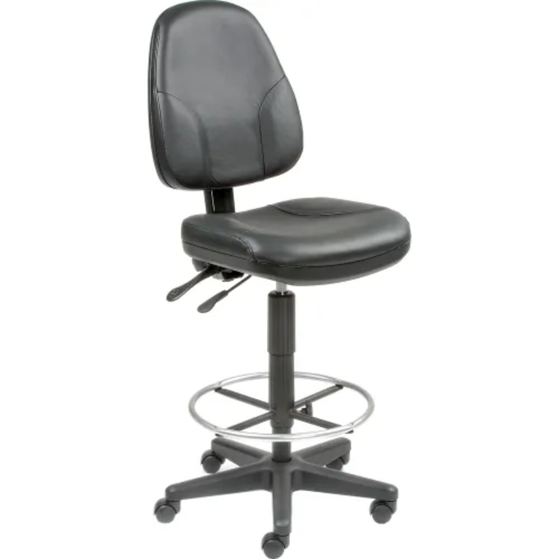 Back and seat angles synchronize to your body’s position for daylong comfort. Adjustable Stool has pneumatic 24 to 29″H adjustable seat and 7-1/2 to 11″H adjustable footrest ensure proper foot and leg support. Generously sized seat is 3-1/2″ thick padding upholstered with genuine black leather seating surfaces that have a waterfall edge to reduce knee stress and improve circulation. Contoured 2-1/2″H adjustable back ensures improved posture with lumbar support. Polypropylene steel reinforced base has 2″ carpet casters. All adjustable stools include a 2 Year Limited Warranty. Seat measures 18″ sq. and back measures 17-1/2″W x 19″H. Brand is Interion By Global Industrial. Easy assembly.