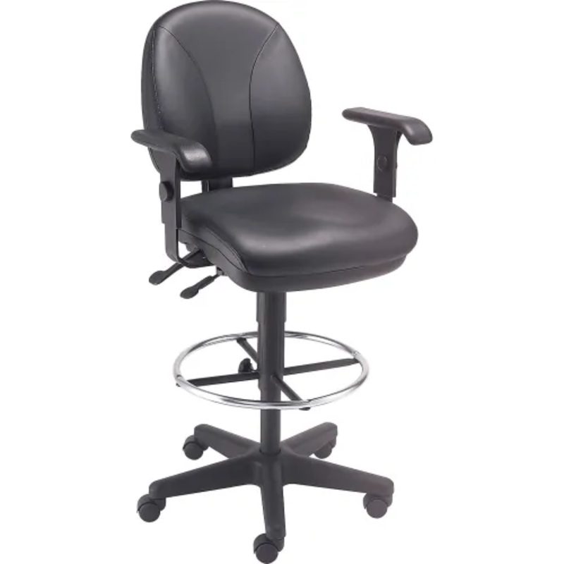 Adjustable stool back and seat angles synchronize to your body’s position for daylong comfort. Pneumatic 24″-29″H adjustable seat and 7-1/2″-11″H adjustable footrest ensure proper foot and leg support. Adjustable stool generously sized seat is 3-1/2″ thick padding upholstered in genuine black leather seating surfaces with a waterfall edge to reduce knee stress and improve circulation. Contoured 2-1/2″H adjustable back ensures improved posture with lumbar support. 3″ vertical and 1″ side-to-side adjustable T-arms align arms and wrists for keyboard use. Polypropylene steel reinforced base has 2″ carpet casters. All stools include a 2 Year Limited Warranty. Seat measures 18″ sq. and back measures 17-1/2″ sq. Brand is Interion By Global Industrial. Easy assembly.