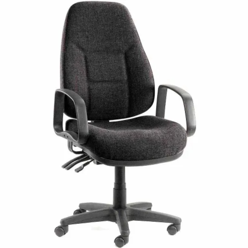 This 5-way adjustable executive chair helps increase productivity and energy level throughout the day. Oversized, thick 5″ foam cushioning is covered with durable Scotchgard nylon fabric. Luxuriously comfortable, plush foam waterfall design seat and back are ergonomically constructed to prevent back and leg fatigue. Simultaneous adjustment of back angle and seat tilt with Synchro control for personalized positioning. Customize back height for proper lumbar support. 17-3/4″ to 21-1/4″ pneumatic seat height adjustment. Arms are side to side adjustable and are covered in resilient textured urethane over steel. 5 blade base with dual wheel casters for smooth mobility. Easy assembly. Brand is Interion By Global Industrial. 2 Year Limited Warranty.