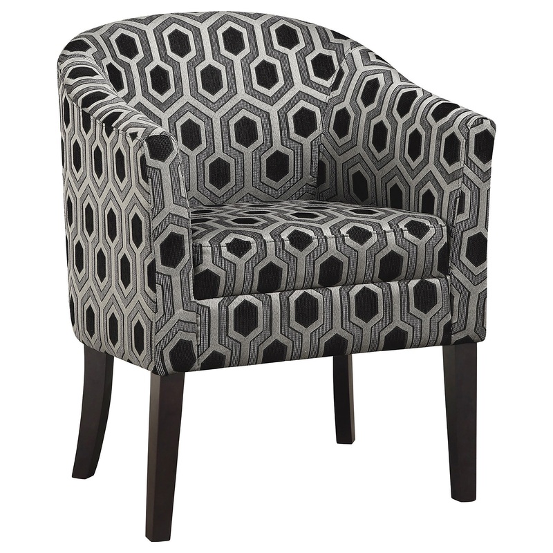 Pull out the retro design blueprint and add this accent chair to the mix. A busy print in grey and white dazzles within a monotone or colorful blend of surrounding furnishings. Retro in style, its barrel back silhouette speaks to the beloved look of mid-ce