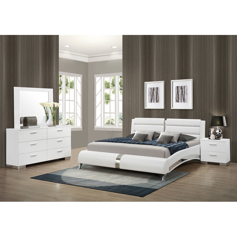Sleek and contemporary, this four-piece bedroom set exudes modern glamour. Its white, polyurethane coating is pleasingly polished to a gorgeous, glossy finish. The mirror and case pieces are simple and straight. The sturdy bed frame boasts a boldly curved shape. Gleaming, chrome hardware completes its design with even more brilliant shine.