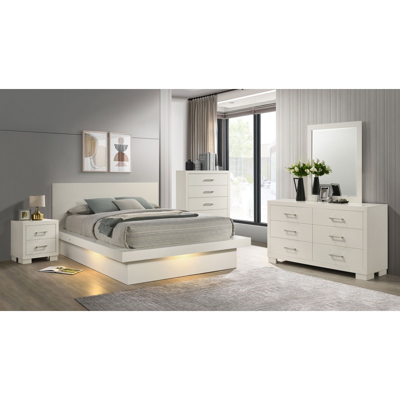 This stately 5-piece bedroom set is a showpiece set from the Jessica collection and includes a chest and dresser as well as nightstand that can be placed at arm’s reach with the optional nightstand panel on the bed. The bed has smooth, clean lines and is crafted in a platform style for a modern touch. The nightstand and chest are fashioned with deep drawers highlighted by contrasting lustrous hardware for added style. The sturdy dresser features six drawers and a broad top perfect for the accompanying rectangular mirror. Each piece in the set is built from solid wood and ash veneers with a warm cappuccino finish that’s also available in brilliant snow white.