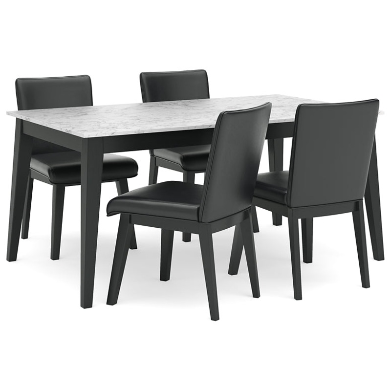 This dining package exudes modern sophistication. The rectangular table, finished in a sleek black wood tone, is adorned with a stunning white faux marble tabletop. Side chairs with faux leather upholstery offer added comfort and style. It's a simply strik