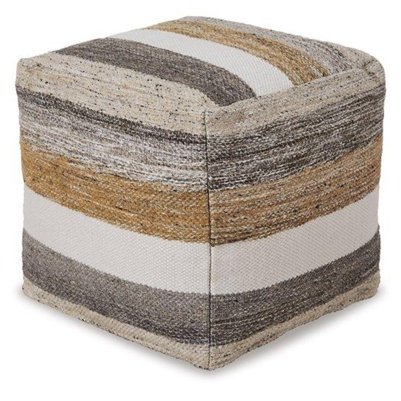 Weaving together stripes in grounded, earthy tones, this pouf is a natural beauty. It combines simple flair and function, with hues of white, honey and shades of gray and brown to keep things casual. Whether used as a footrest or a side table, this piece h