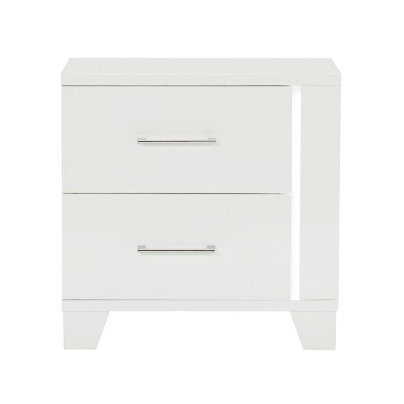 Kerren Collection by HomeleganceWhite high gloss finishCrafted from manmade wood and wood Polished chrome tone bar pulls 2 drawers Dovetail drawers construction Ball bearing drawer glides LED lighting strip with touch sensor