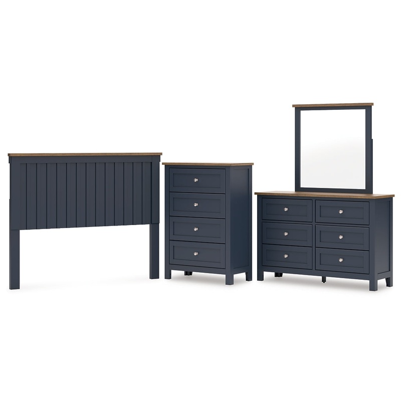 | Details | B414-57: Made with hardwood solids, mindi wood veneer and MDF substrates, Two-tone finish features a dark slate blue with a light brown wood-tone top, ” bolts (not included) are needed to attach headboard to your existing bed frame, Assembly required, B414B1: Includes dresser and mirror, Made with hardwood solids, mindi wood veneer and MDF substrates, Two-tone finish features a dark slate blue with light brown wood-tone top, Nickel-tone metal knobs, 6 drawers with fully finished interior, dovetail construction and heavy duty ball-bearing side glides, Mirror attaches to back of dresser, B414-45: Made with hardwood solids, mindi wood veneer and MDF substrates, Two-tone finish features a dark slate blue with a light brown wood-tone top, Nickel-tone metal knobs, 4 drawers with fully finished interior, dovetail construction and heavy duty ball-bearing side glides, |