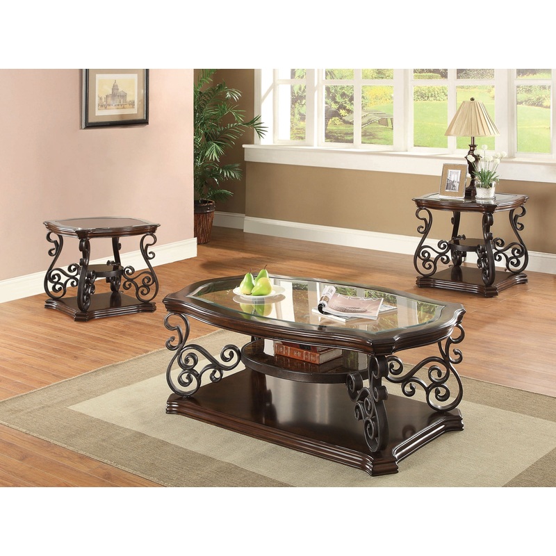 This sophisticated coffee table set combines timeless elegance with functional design. Each piece features a clear tempered glass top for durability and a polished look, supported by ornate scrollwork on dark bronze powder-coated metal legs. The dark merlot wood finish enhances the engineered wood and cherry veneer construction, while the middle shelves provide additional storage with their polished wooden surfaces. Perfect for elevating any living room with coordinated and classic appeal.