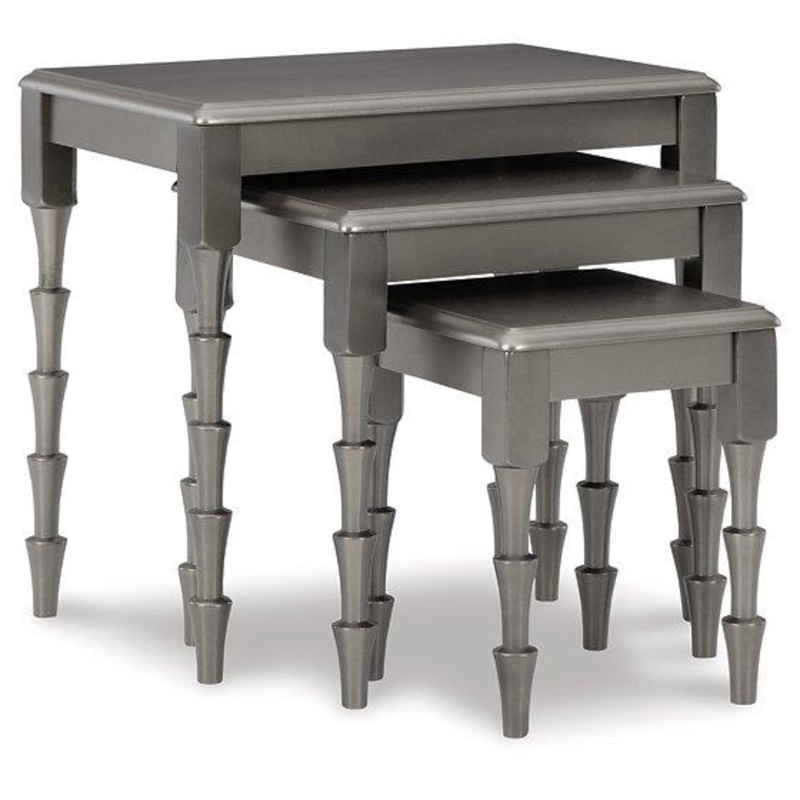 Add a uniquely chic touch to your nest with this 3-piece nesting table set. Finished in a metallic gray for a hint of sheen, this fabulous threesome takes contemporary form and functionality to another level. More About This Product Product DetailsSet of 3