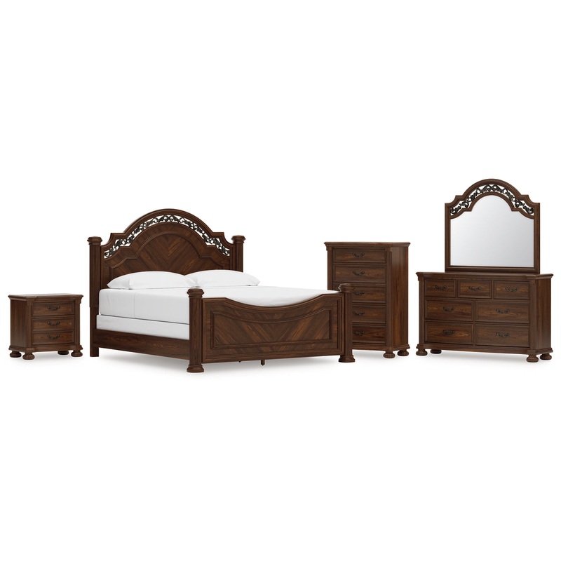 Details B764B9: Includes poster headboard/footboard panels, rails and headboard posts, Made with hardwood solids, cherry veneer with MDF substrates, decorative cast resin and furniture grade plastic components , Cherry brown finish, Headboard with metallic accent filigree, Foundation/box spring required, sold separately, Mattress available, sold separately, Assembly required, B764B1: Includes dresser and mirror, Made with hardwood solids, cherry veneer with MDF substrates, decorative cast resin and furniture grade plastic components , Cherry brown finish, Decorative metal drawer pulls with dark bronze-tone finish, 7 drawers with fully finished interior, dovetail construction and ball-bearing side glides, Mirror attaches to back of dresser, B764-46: Made with hardwood solids, cherry veneer with MDF substrates, decorative cast resin and furniture grade plastic components, Cherry brown finish, Decorative metal drawer pulls with dark bronze-tone finish, 5 drawers with fully finished interior, dovetail construction and ball-bearing side glides, B764-93: Made with hardwood solids, cherry veneer with MDF substrates, decorative cast resin and furniture grade plastic components, Cherry brown finish, Decorative metal drawer pulls with dark bronze-tone finish, 2 drawers with fully finished interior, dovetail construction and ball-bearing side glides, Pull-out tray behind bottom drawer,