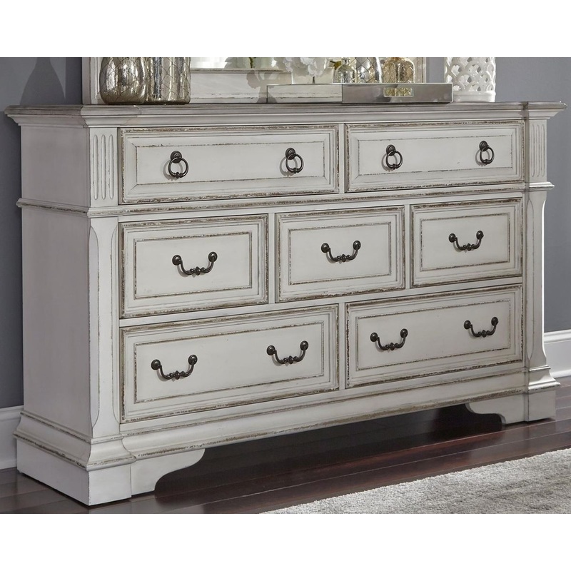 Liberty Furniture Abbey Park Drawer Dresser in Antique White 520-BR31. Bring a feeling of lived in sophistication to your home with this elegant collection. Featuring a number of beautifully crafted pieces, with charming construction details and an antique white finish, any piece from this group will bring an abundance of style and functionality to your space.