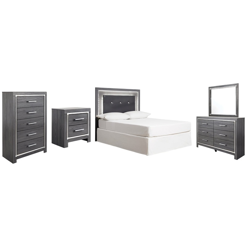 Details B214-46: Made of engineered wood (MDF/particleboard) and decorative laminate, Gray finish with replicated wood grain, Faceted chrome-tone pulls and accents, 5 smooth-operating drawers, Drawer interiors are lined with a faux linen laminate for a clean, finished look, Safety is a top priority, clothing storage units are designed to meet the most current standard for stability, ASTM F 2057 (ASTM International), Drawers extend out to accommodate maximum access to drawer interior while maintaining safety, B214-92: Made of engineered wood (MDF/particleboard) and decorative laminate, Gray finish with replicated wood grain, Faceted chrome-tone pulls and accents, 2 smooth-operating drawers, Drawer interiors are lined with a faux linen laminate for a clean, finished look, USB and wireless charging options, Power cord included; UL Listed, Assembly required, B214-87: Made of engineered wood (MDF/particleboard) and decorative laminate, Gray finish with replicated wood grain, Faux leather upholstery, Faux crystal and faceted chrome-tone metal accents, Accent LED lights with remote to control color and brightness, Included remote holder keeps remote for lights discreet and accessible, Hardware not included, ” bolts are needed to attach headboard to existing metal bed frame, Capable of attaching to a full sized metal bolt-on bedframe, Power cord included; UL Listed, Mattress and foundation/box spring available, sold separately, Assembly required, B214B1: Made of engineered wood (MDF/particleboard) and decorative laminate, Gray finish with replicated wood grain, Faceted chrome-tone pulls and accents, 6 smooth-operating drawers, Drawers lined with faux linen laminate, Mirror attaches to back of dresser, Includes tipover restraint device, Assembly required,