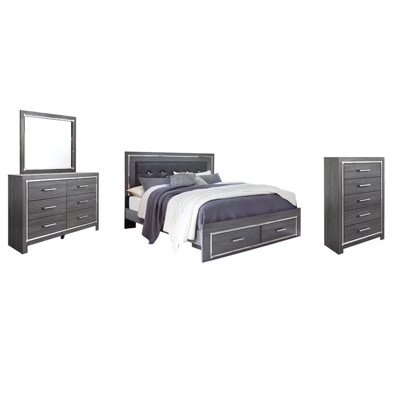Lodanna King Panel Bed with 2 Storage Drawers with Mirrored Dresser, Chest and Nightstand