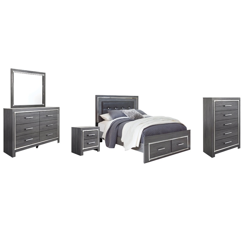 Lodanna Queen Panel Bed with 2 Storage Drawers with Mirrored Dresser, Chest and Nightstand