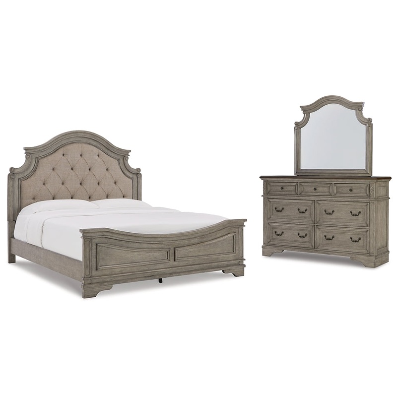 Details B751B5: Includes California king headboard, footboard and rails, Made with acacia wood, birch and acacia veneers, engineered wood and cast resin components, Antiqued gray finish, Ornately shaped headboard with inset upholstered cushion, Foundation/box spring required, sold separately, Mattress not included, sold separately, Assembly required, B751B1: Includes dresser and mirror, Made with acacia wood, birch and acacia veneers, engineered wood and cast resin components, Two-tone finish; antiqued gray body with a rich, deep walnut brown finish on top, Dark bronze-tone bails and knobs, 7 smooth-gliding drawers with dovetail construction, Framed drawer fronts , Overlay decorative corbels, Mirror attaches to back of dresser, Assembly required,