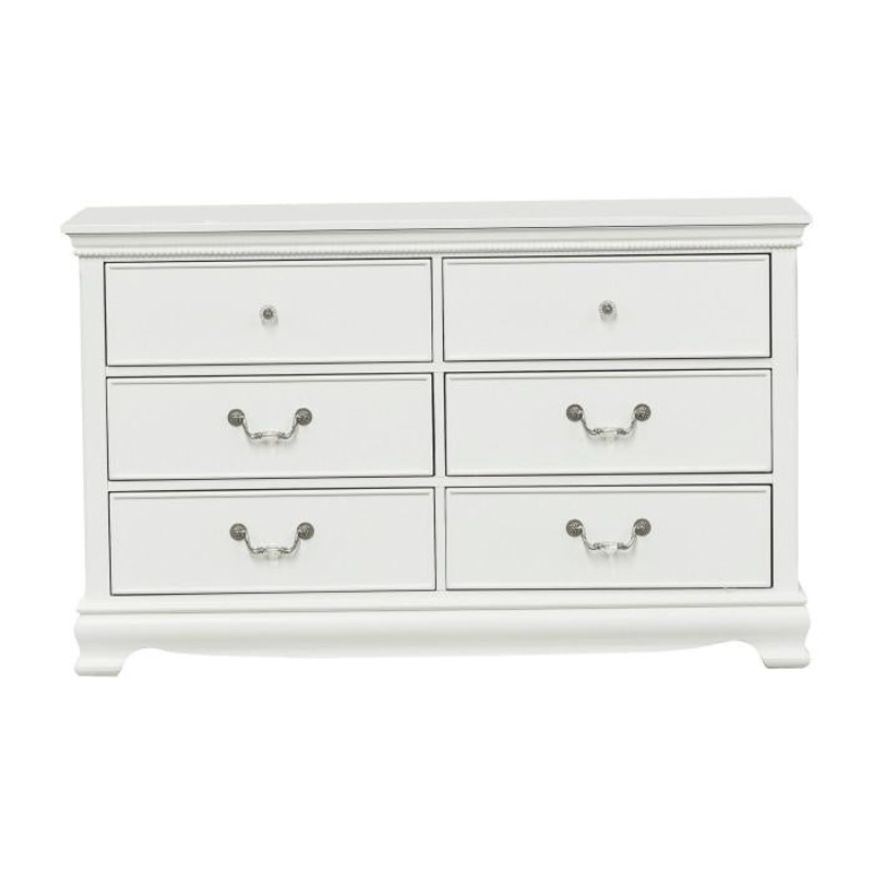 Lucida Collection by HomeleganceWhite finiishMade of manmade woodBead moldingShell motif6 DrawersDovetail drawersMetal on metal center glidesPolished nickel-tone knobs and drop handles