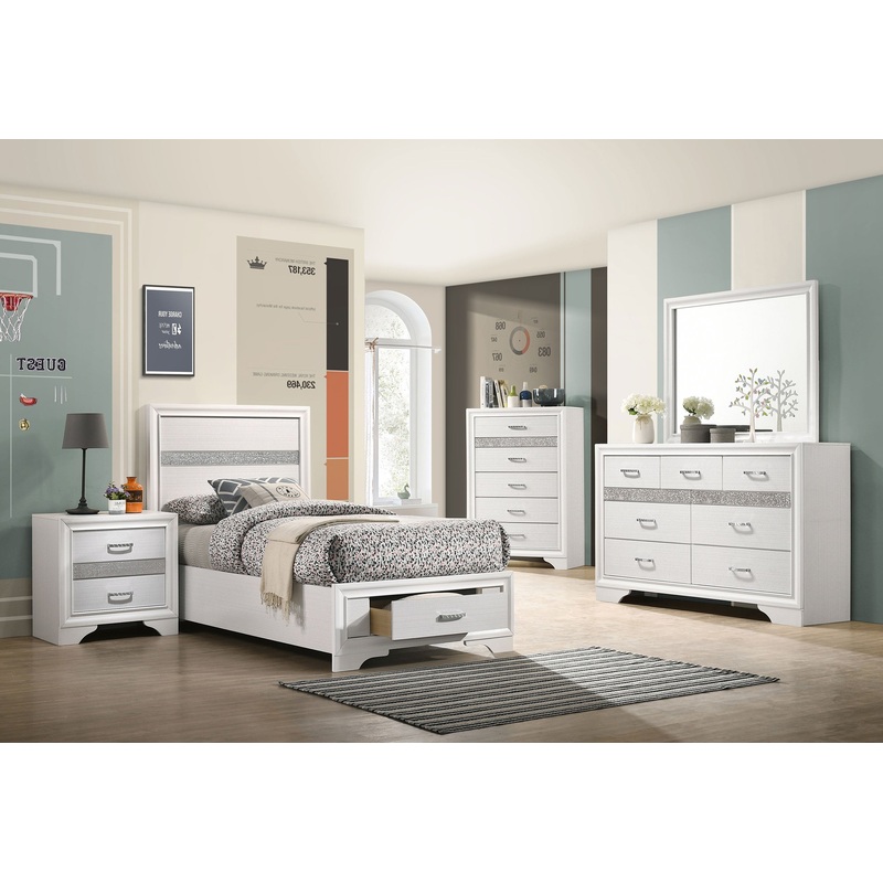 Stylish and ultra-chic, this glamorous, five-piece bedroom set is the ultimate in modern luxury. A bed, nightstand, dresser, mirror, and chest are all included, giving you everything you need to complete your bedroom ensemble. The mattress-ready platform bed offers the added bonus of footboard storage. The dresser, nightstand, and chest are also equipped with roomy drawers to maximize storage space. Glittery stripes and rhinestone detailing add a brilliant touch of bling to this exquisite bedroom set.