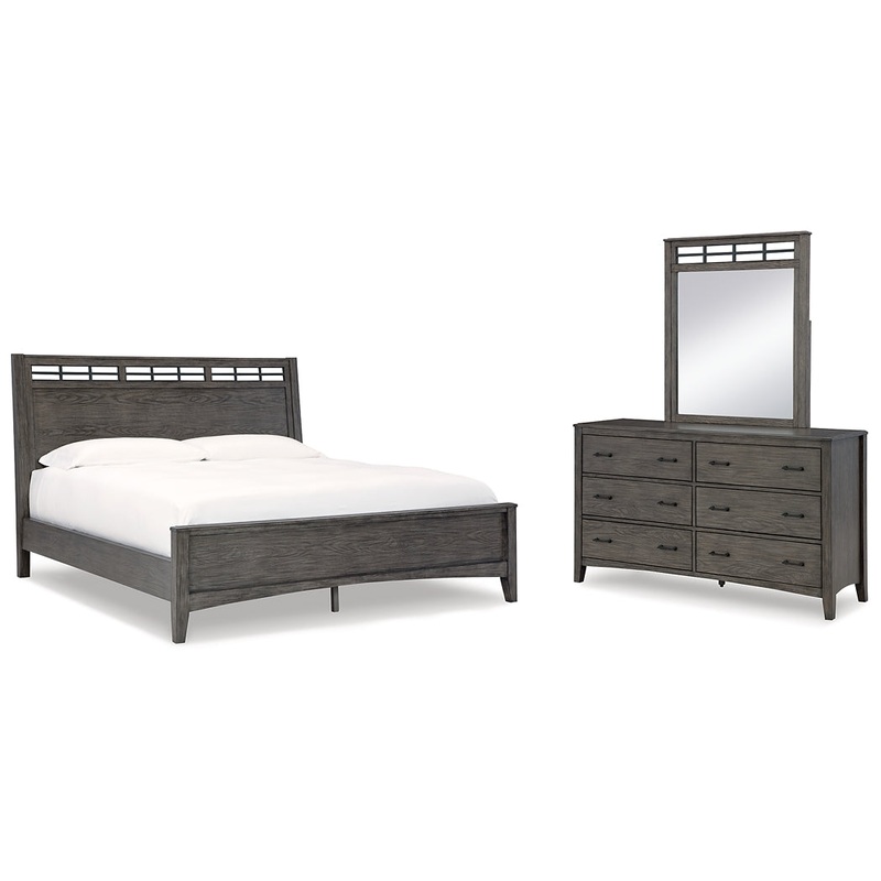 | Details | B651B2: Includes queen panel headboard, rails and footboard with slats , Made with hardwood solids and MDF substrates, Medium gray-brown finish with a blackened wood grain contrast; embossed wood grain texture, Lay-back headboard , Decorative inset metal grille with matte black finish , Foundation/box spring required, sold separately, Mattress not included, sold separately, Assembly required, B651B1: Includes dresser and mirror, Made with hardwood solids and MDF substrates, Medium gray-brown finish with a blackened wood grain contrast; embossed wood grain texture, Metal bar pulls with matte black finish, Inset drawers, 6 smooth-gliding drawers with fully finished interiors and metal ball-bearing side glides (top drawers felt lined), Mirror attaches to back of dresser, |