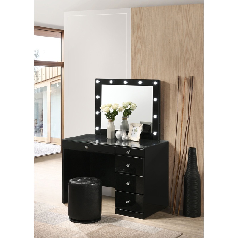 Morgan – Vanity Desk With Glass Top, LED Mirror & Stool – Black