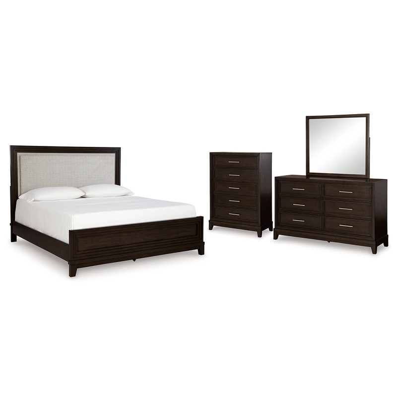 | Details | B618B2: Includes upholstered panel headboard, panel rails and panel footboard with slats, Made with hardwood solids, engineered wood and MDF substrates, Grayish brown wood-tone finish, Floating inset upholstered panel in polyester Next-Gen Nuvella performance fabric surrounded by LED backlight, Next-Gen Nuvella is a family-friendly fabric that is soft, easy to clean, stain-resistant and durable, Clean fabric with mild soap and water, let air dry; for stubborn stains, use a solution of 4 oz. bleach to 28 oz. water, Light switch is located on each side of headboard and includes dual USB charging port (USB-A and USB-C), Power cord included; UL Listed, Foundation/box spring required, sold separately, Mattress available, sold separately, Assembly required, B618B1: Includes dresser and mirror, Made with hardwood solids, engineered wood and MDF substrates, Grayish brown wood-tone finish, Metal bar pulls with satin nickel-tone finish, 6 smooth-gliding drawers with dovetail construction and heavy duty ball-bearing side glides (top drawers felt lined), Mirror attaches to back of dresser, B618-46: Made with hardwood solids, engineered wood and MDF substrates, Grayish brown wood-tone finish, Metal bar pulls with satin nickel-tone finish, 5 smooth-gliding drawers with dovetail construction and heavy duty ball-bearing side glides (top drawers felt lined), |