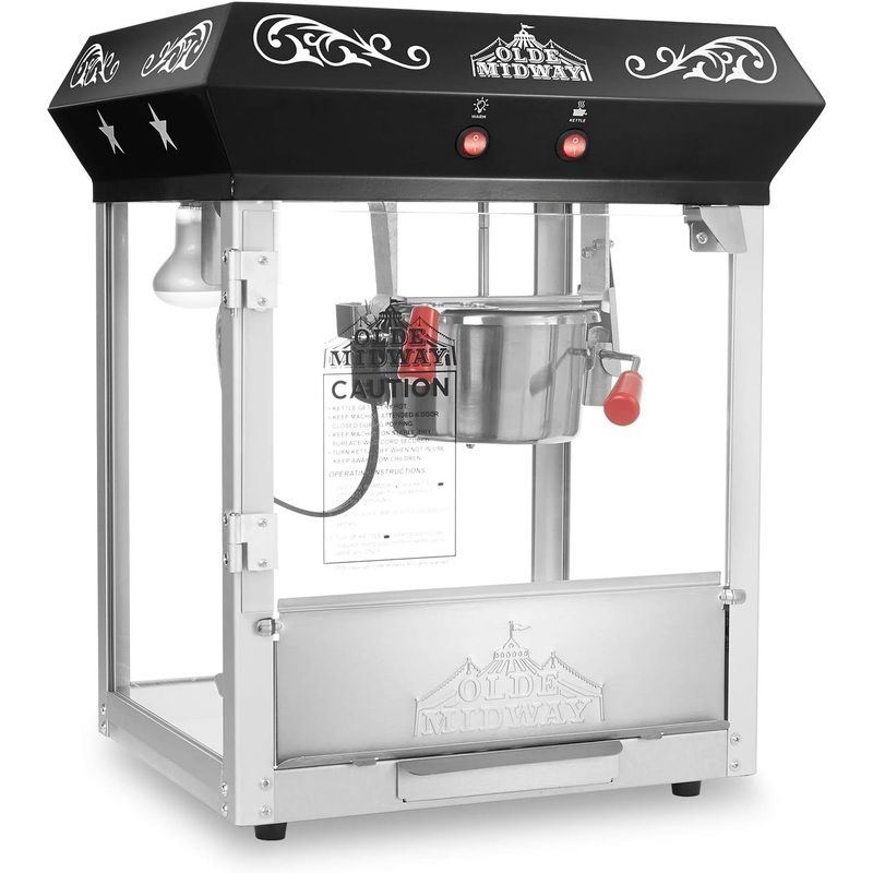Olde Midway Bar Style Popcorn Machine Maker Popper with 6-Ounce Kettle Black Enjoy making gourmet, movie-theatre style popcorn anywhere with the Olde Midway Antique style tabletop popcorn machine. Offering nostalgic charm with a retro-style design, this pr