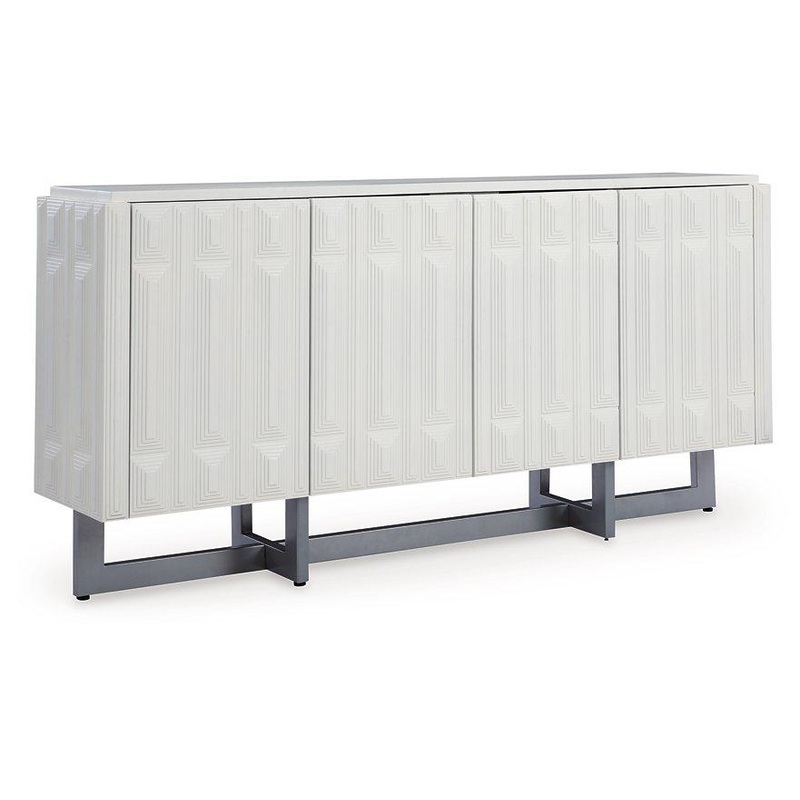 Keep things contemporary cool with the Ornawel accent cabinet. The step pattern on the door fronts lends an appealing geometric touch, with a lightly distressed white finish enriching the design. Touch latch doors open to reveal two shelves for all your st