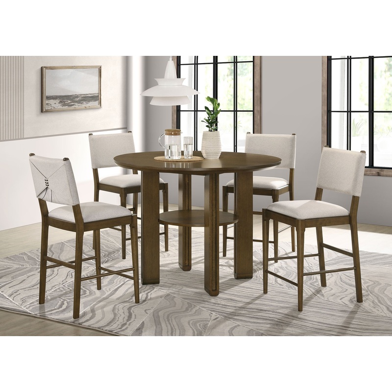 This counter-height dining set blends transitional style with practical design, creating a warm and inviting space for casual dining. The set includes a round counter-height table with a rich brown finish, angular legs, and an open lower shelf for added fu